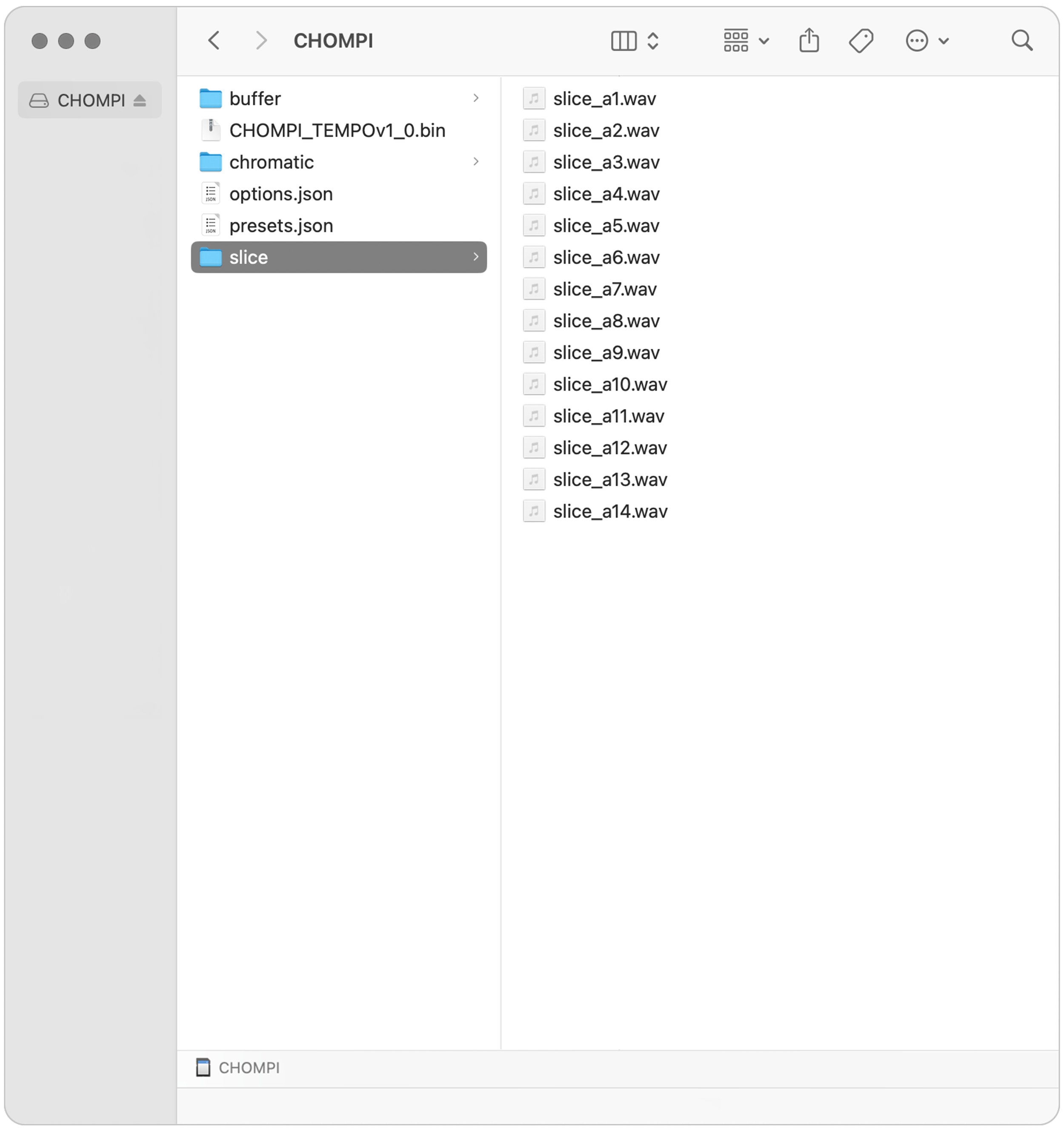 Once CHOMPI’s firmware has been updated, feel free to manage or add new samples on your SD card. If you would like to customize your user options, feel free to generate a new options.json through the CONFIG Tool.